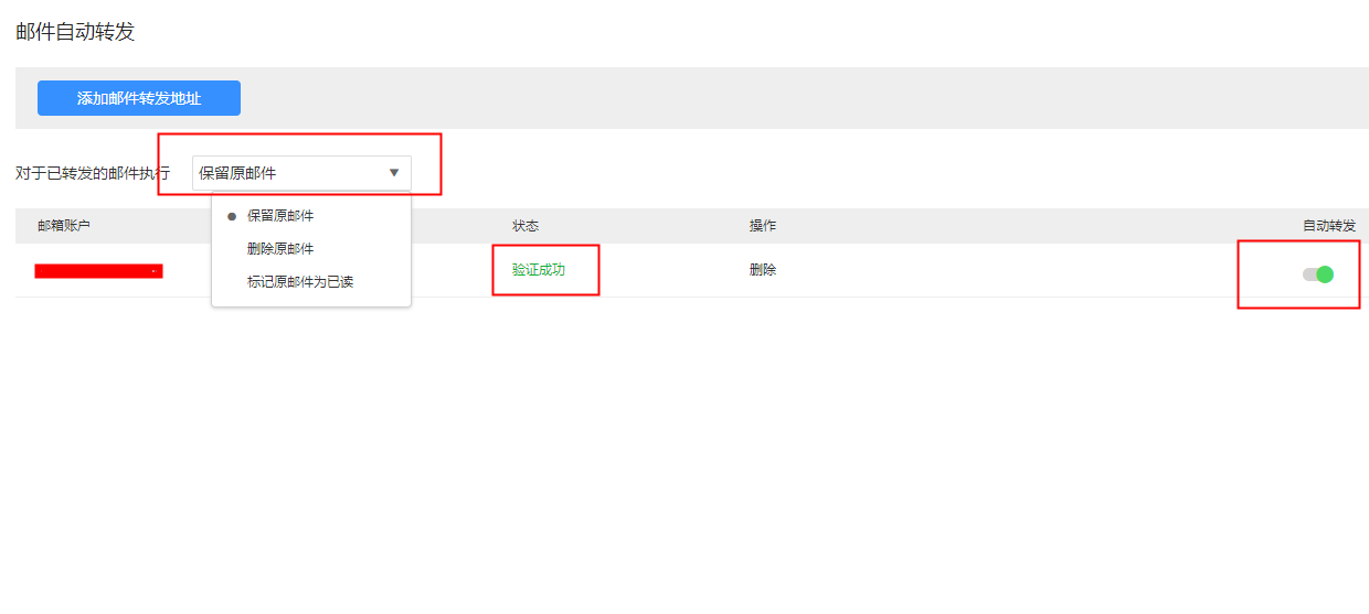3、最后选择对已转发的邮件执行保留原邮件、删除原邮件或标记原邮件为已读的操作。