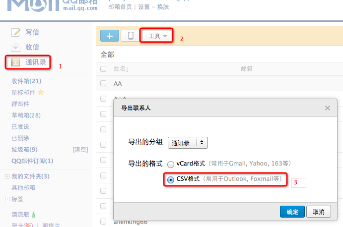 通讯录→工具→导出联系人→CSV格式
