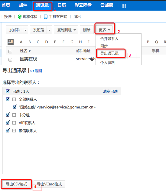 通讯录→更多→导出→CSV格式
